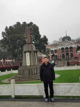 转过身,向外走,门前是一个小广场。广场上,有一尊塑像。绕到正面一看,是孙中山的塑像。他身穿长衫,手拿礼貌,矗立在风雨之中。他神色凝重,望着前方。他展望的前方,到底有多遥远,我一点也不知道。他凝重的神态,让现在的我,看起来,心里都沉甸甸的,让我不能不肃然起敬。