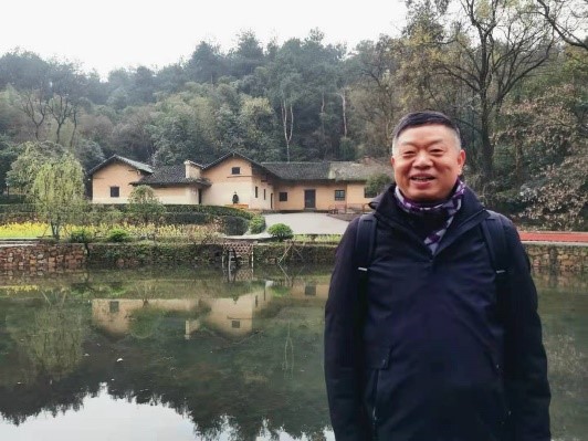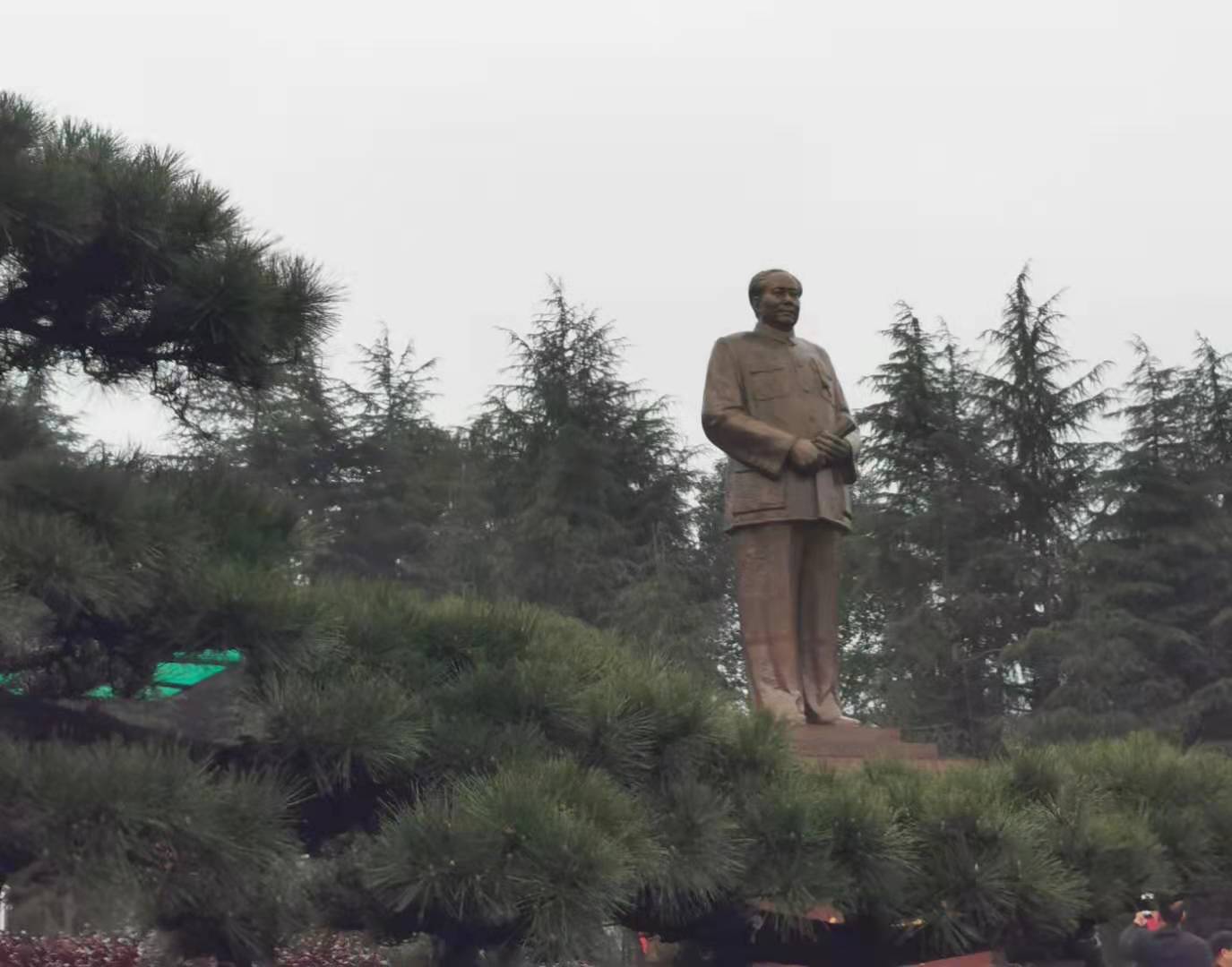 下车是一段小水泥路,路旁是庄稼地。庄稼地里,油菜花已经开放了,黄灿灿的一片,焕发出淡淡的优雅清香。往前走,有个广场。我每到一个新的地方,方向感就不强了,极容易转向。如果没错的话,应该是在广场的东北方向,树立了一尊毛泽东主席的塑像。