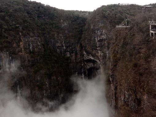 走出电梯口,绕过一段紧贴在山腰间的蜿蜒栈道,就可以看见,在陡峭挺拔的山梁之间,有一座豁然洞开的天门,通往另外一个世界。天门洞开,一股股雾岚,轻轻漫漫飘逸过来,仿佛洞外面的世界,就是仙境,就有天仙玉女。走近天门洞来。天门洞外仍是一片大雾,什么也看不见,或许正是因为这种看不清的遗憾,才感觉到那洞外的世界的神奇吧。