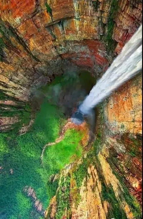 51、委内瑞拉,奥扬峰,天使瀑布。瀑布沿陡壁直泻而下,几乎未触及悬崖,直接落差大807米,总落差达980米。