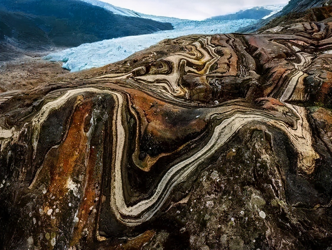 62、挪威,Engabreen 冰川的边缘。扭曲的岩石结构见证了其沧桑的历史。