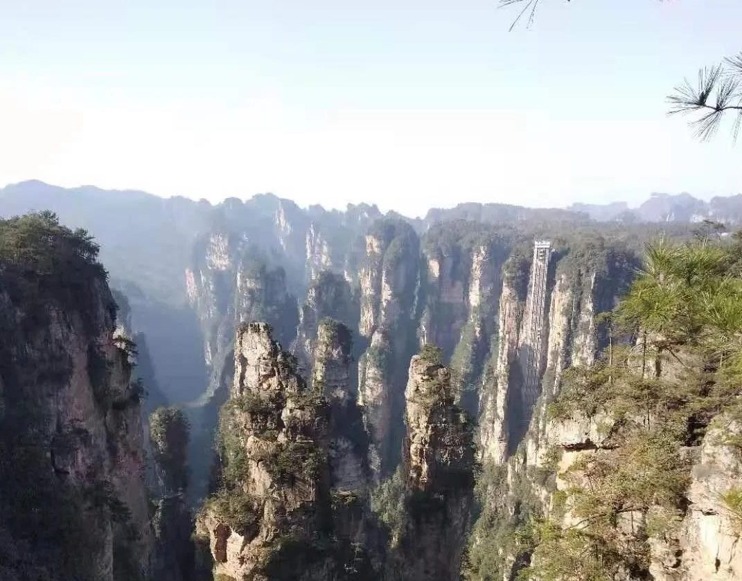 转眼间就来到了百龙云梯一公里开外的对面山头上,这里也正在搞景点开发建设,对着很远的云梯,大家都拍照留影,此时几百米高的天梯也只有半个手臂长,我们站的地方海拔比它的顶部还高;