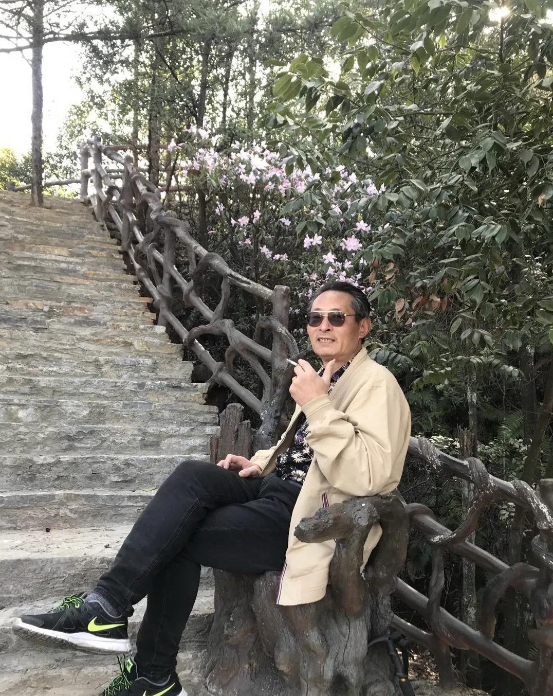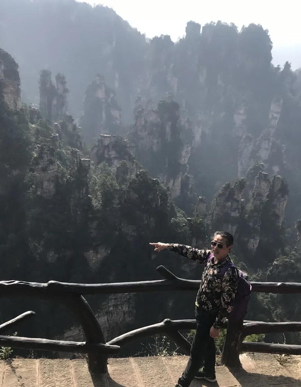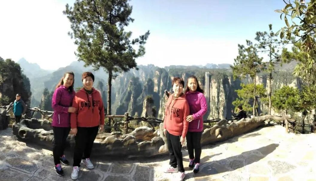 我们走到一处观景台,瞭望着对面的天梯,坐在人工制作的“树墩”上,抽着烟、赏着景尽情开怀 ,也都竞相拍照。