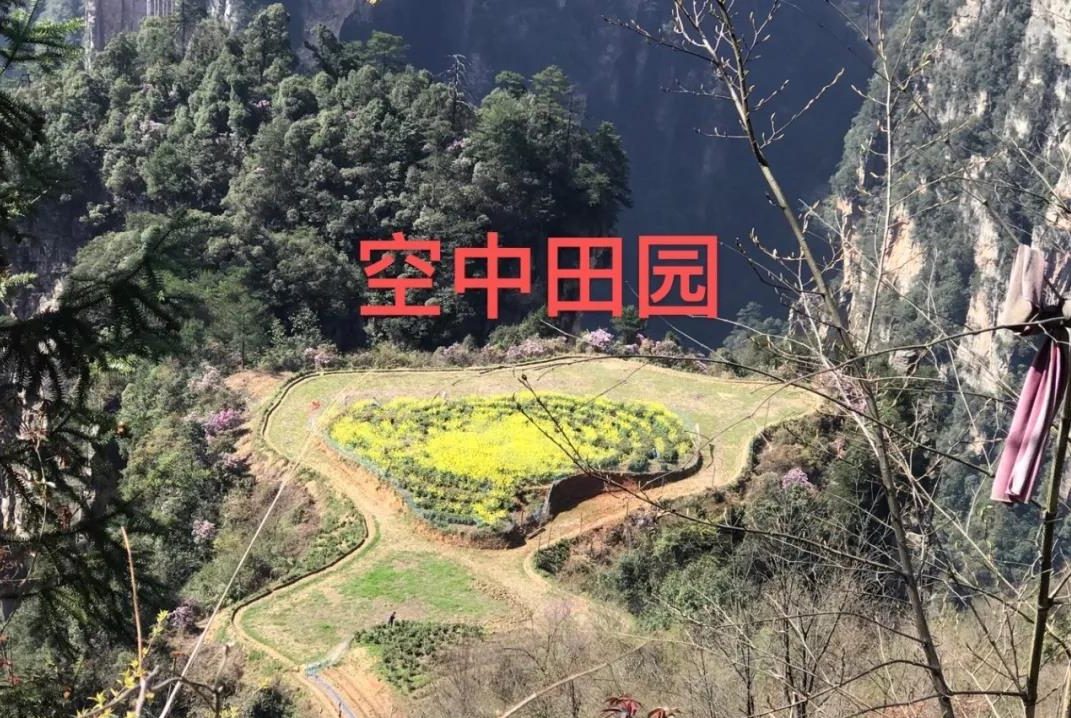 所谓“空中田园”,就高空俯视,下面突兀着一块近百亩人工开垦的平地,平地周边又是万丈深渊,在不同季节种植不同的植物,这个季节最显眼的当属就油菜花了。