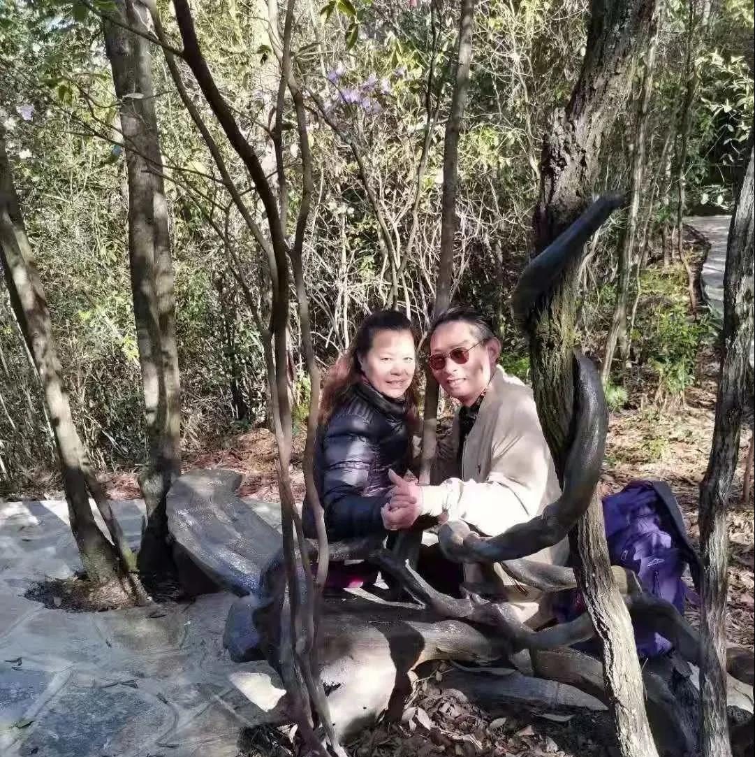 这是在斑驳的树影下,一处人工石凳上,拍的”恩爱“照。