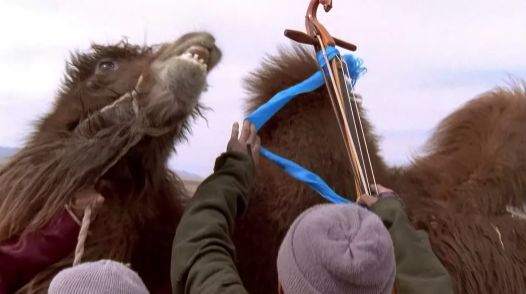 在刚开始,骆驼会很有攻击性;但渐渐地,随着牧民们的抚摸,伴着马头琴悠扬的旋律以及先生的歌声,她的感情被唤醒——也许她是回忆起小时候母亲给自己哺乳的场景,那时,自己也是听着这样的旋律第一次被母亲哺育。