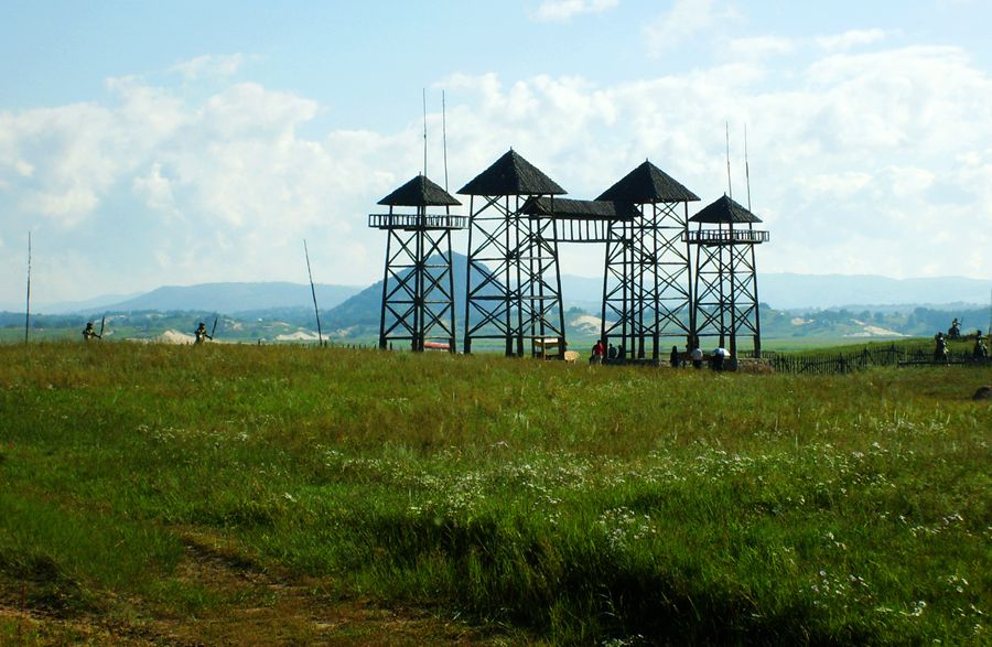 告别灯笼河花海,去贡格尔大草原。蓝天白云依旧。在这里我们参观了中央影视基地,一块块竖起的大石头上刻着“成吉思汗”、“康熙王朝”、“汉武大帝”、“还珠格格”、“射雕英雄传”等大字。大家徜徉在露天的影棚里尽情的拍照。这里的景色真的太美了,有碧绿的青草,有山丘,有湿地,有大片白桦林,还有百里大风车,随便选个角度入镜都是一幅绝美的风景画。