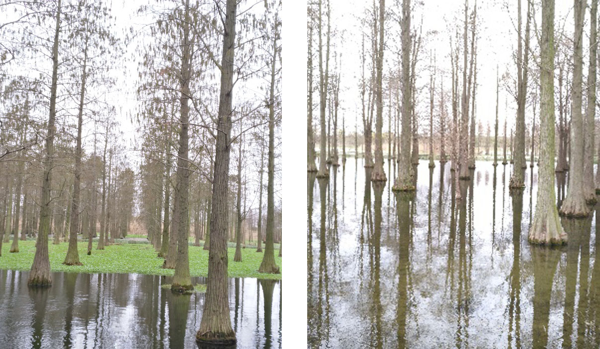 当我踏上水上森林长廊的一刻起惊呆了,这是我从来没有看过的景色。一棵棵挺拔的池衫深深地扎根在水深达2米多的河里;一棵棵高约10米池杉与水上碧绿的金钱草交融在一起,金钱草好似绿色的地毯铺在水面上;一排排笔直的,树龄在39年以上池杉昂首挺立矗立在水中。而池衫树上没有一片绿叶子,可是,每一棵树根部却深深地藏着绿,等待来年春天枝繁叶茂,郁郁葱葱。