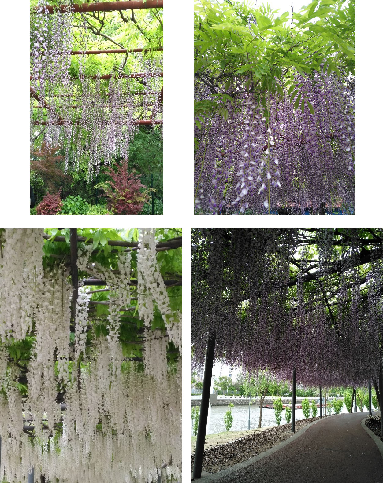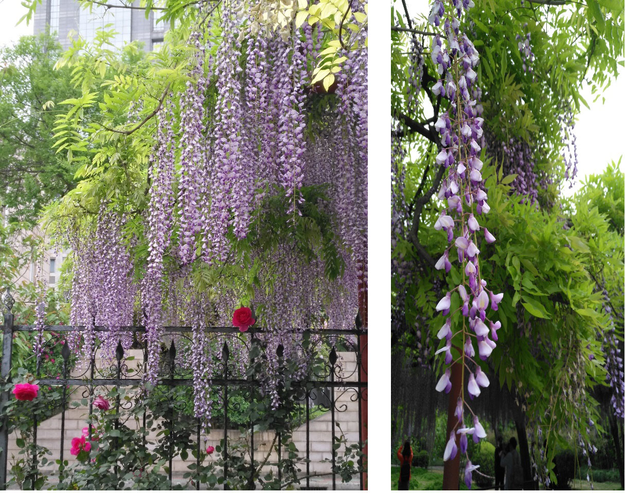 置身在架占为1500平方米紫藤花花海中的我,凝视二百多余株紫藤花穗(60—90厘米),最长超过150厘米硕大花朵紫藤花,从空中垂下,心中有了无限的想象。这些紫色的紫藤花像一个个美丽的少妇拿着小铃铛在风中翩翩起舞,淡淡的清香又随着铃声向远处飘去。浅绿色的紫藤花像一个个靓丽的小姑娘,在青青河水映照下更楚楚动人。眼前这一切美景,让我想起李白诗:“紫藤挂云木,花蔓宜阳村,密叶隐歌鸟,香风留美人。”