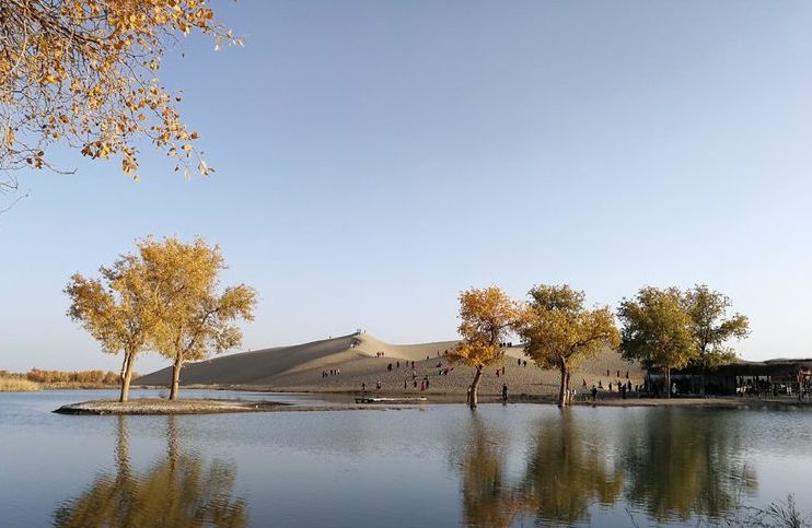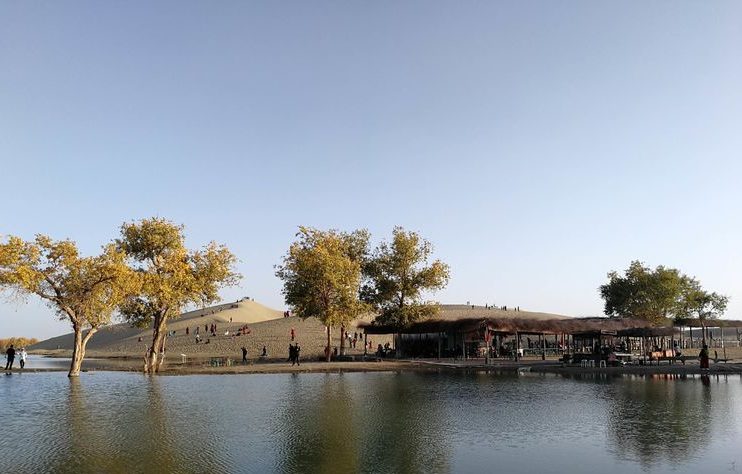 沙州中的胡杨树,远处沙丘是塔克拉玛干沙漠,近处是塔里木河,新疆第一大内陆河。