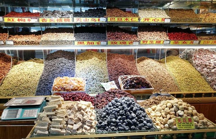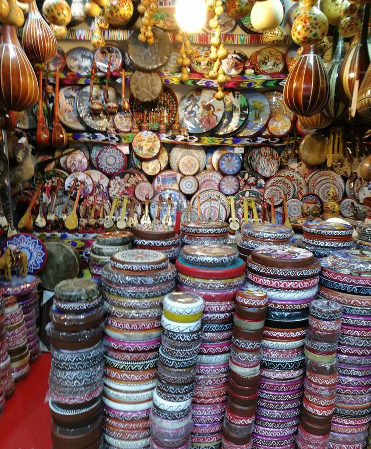 摊位上以干果、水果、奶制品、肉制品居多,还有服装、刀具、民族乐器、绘画、雕刻、铜饰等等,琳琅满目。干果、水果虽有名,价格也很贵。奶制品新疆的质量很好,有一种奶疙瘩我是初见,像奶糖,不太甜,好吃。但你要多转,要侃价哟!酸奶“西域春”,负有盛名,来新疆一定要品尝。