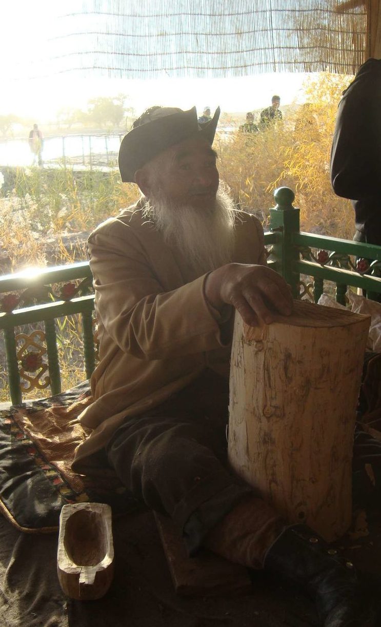 在一处廊亭内,有两位老人家在制做木雕,这是罗布人传统手艺。两位老人一位114岁,一位104岁,真高寿啊,精神矍铄,身体硬朗,还能参加劳动。太令人羡慕了。真是一方水土养一方人。