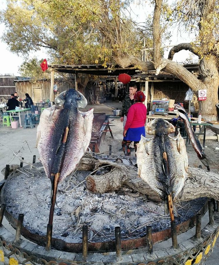 罗布人的生活,有些像原始部落,自由随意。他们不耕田,不放牧,以捕鱼为生,木雕为辅,糊口度日。居住板房简陋,也有老式电视丶洗衣机丶冰箱等,看着就简单丶贫困。现在有了旅游业,也就是有了希望。照片是母子俩在经营小摊,烧烤羊肉丶鱼出卖,十来张小桌,有啤酒佐餐。