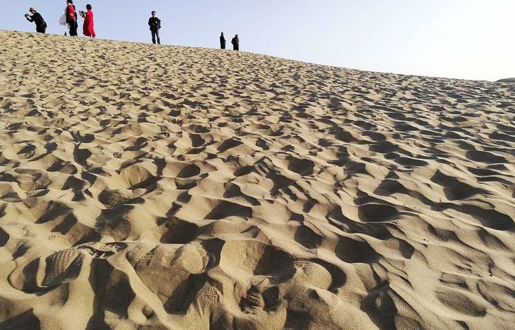塔克拉玛干大沙漠,宛延起伏,连绵不断。沙丘不高,沙砾陷人脚踝,登山挺吃力。游客或躺或坐,休闲自在。大自然的雄伟、辽阔,蓝天白云、风和日丽,好一幅美丽画卷。