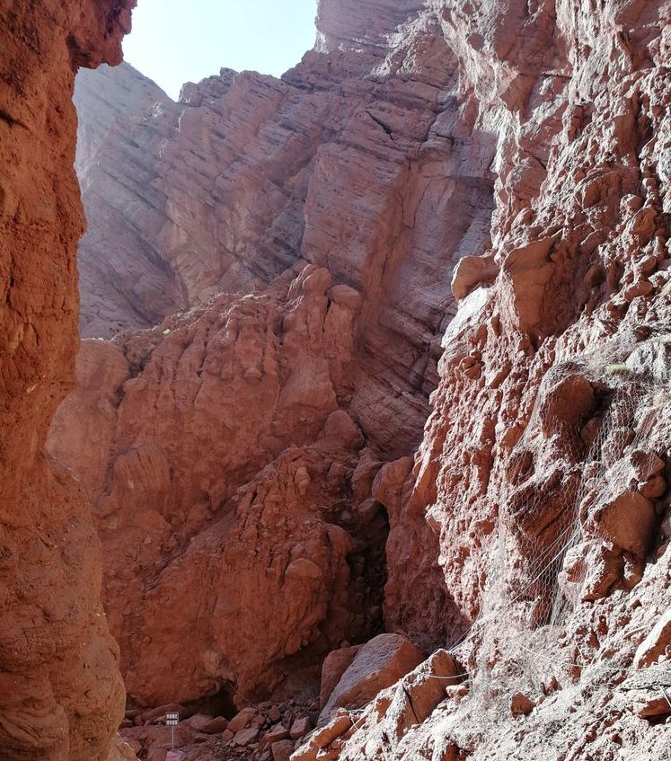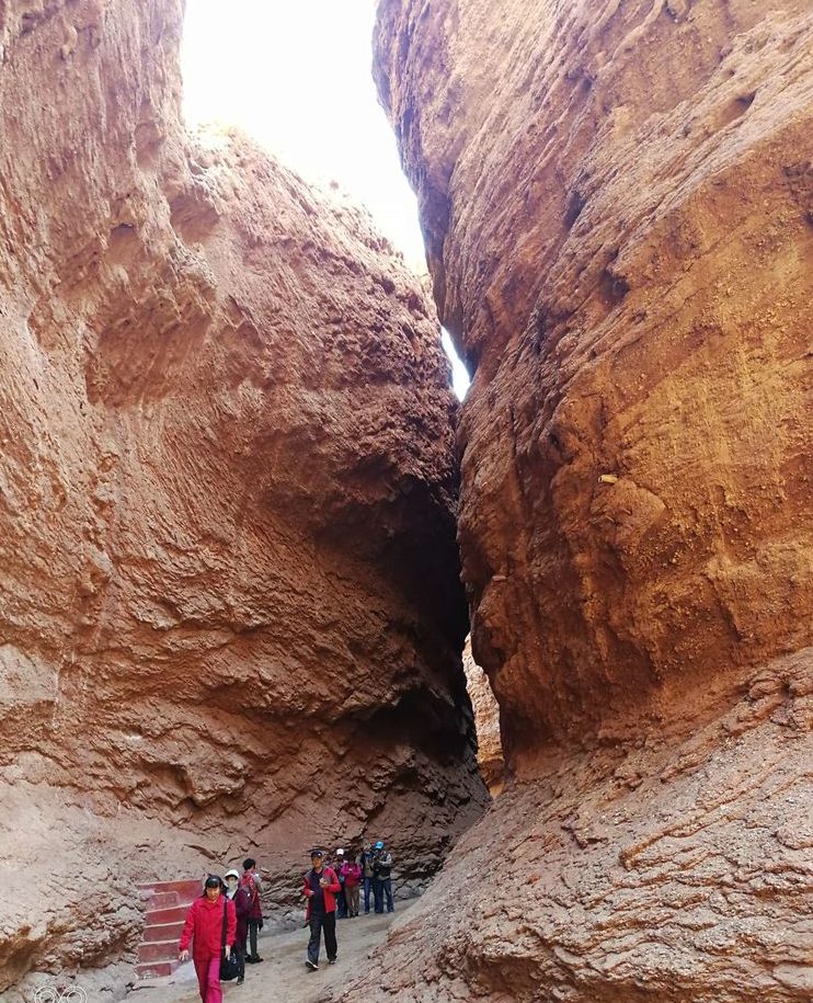天山神秘大峡谷,进门处是一座座赭红色的山峦。游客很多,安检严格。园区开放了5里路程,先爬一个小山岗,有栈桥方便行走。其余的路都是风化的砾石路,走起来吃力。属于丹霞地貌,是中国最大岩盐喀斯特地质景色,有活的“地质演变史博物馆”之称。