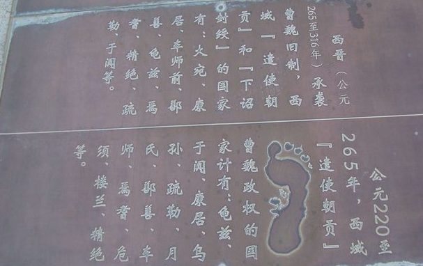 展馆外地面上铺有长长的铜板,刻有西域与中国各朝代交往历史。随手一拍,是西晋、曹魏时期史书记载。晋封绶西域之国有:大宛、康居、车师前、鄯善、龟兹、焉耆、精绝、疏勒、于阗等。曹魏时还有:烏孙、月氏、危须、楼兰等国。