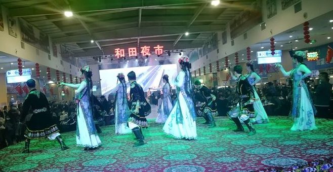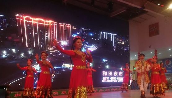 夜市还有歌舞表演,穿着民族服装的姑娘、小伙,歌唱并伴随音乐跳着新疆舞蹈,欢快有力、有节奏感,很能喧染气氛,赢得掌声、欢呼声。持续了约有一个半或两小时之久。