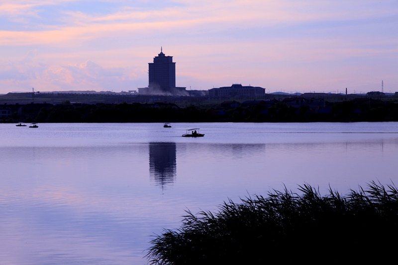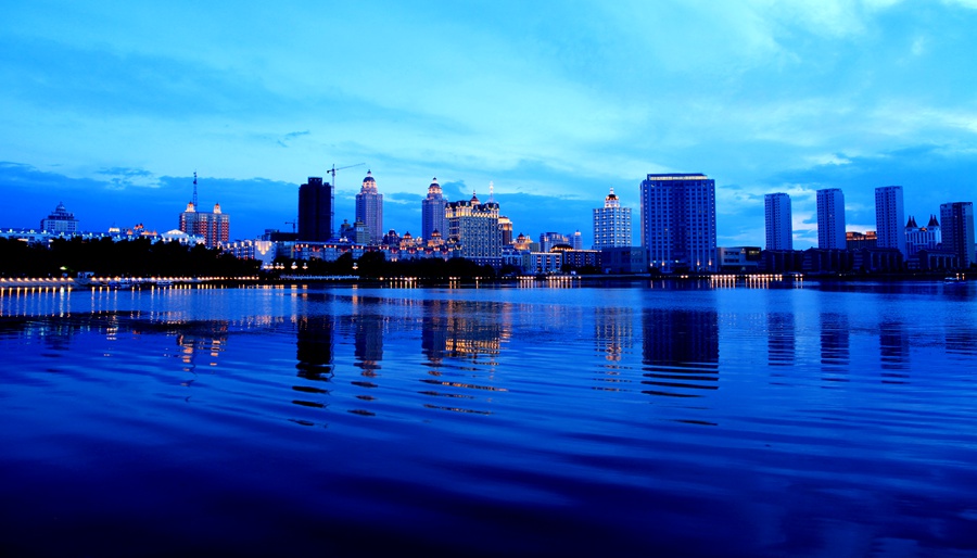 天渐渐黑下来了,云霞散尽的北湖露出了湛蓝的天空,同时湖对面大楼的灯光逐渐亮起,一盏、二盏、三盏,瞬间汇成了灯的海洋。灯光把湖水渲染的色彩斑斓,香格里拉大饭店美轮美奂。几座大楼的倒影与湖水交相辉映。天空有流星划过,地下璀璨的灯光,此景只应天上有,人间能有几回观啊。