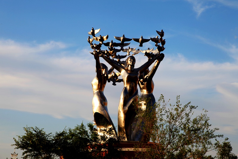 北湖公园不算大,岸边是浓密的芦苇,还矗立着一座俄罗斯风格的高塔,公园里有许多俄式雕塑。夕照下,这些雕塑很有质感。不得不说,满州里的夏天非常凉爽,没有炎热,没有潮湿,在湖边很是舒服。太阳慢慢落山了,天上的云朵连成了片,云层越来越厚完全遮住了夕阳,瞬时北湖的上空彩霞满天飞。