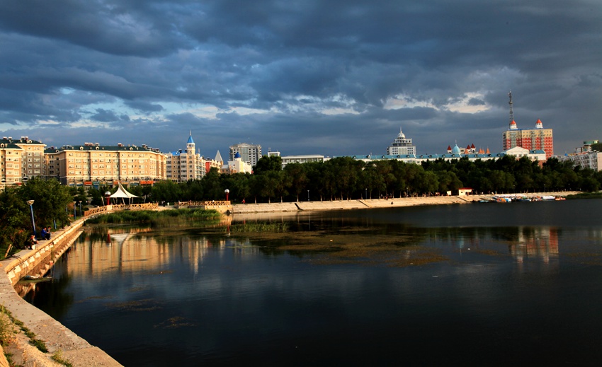 小北湖是观赏满州里夜景的最佳处,我在下午四时就来这里等待日落。北湖离市中心不远,步行20分钟既到。这里是市民休闲的地方,外地游客很少来。有许多俄罗斯人带着孩子来北湖玩。有个小男孩躺在地上打滚,他爸爸叽哩咕噜说着什么,可小男孩则越闹越凶,最后竟裂嘴嚎啕大哭。他爸爸看我在旁边看,就对小男孩说了什么,小男孩这才收了声,抽抽答答的憋嘴,一串串的泪珠往下流。我被这个外国小孩萌呆了,小家伙真是好玩极了。