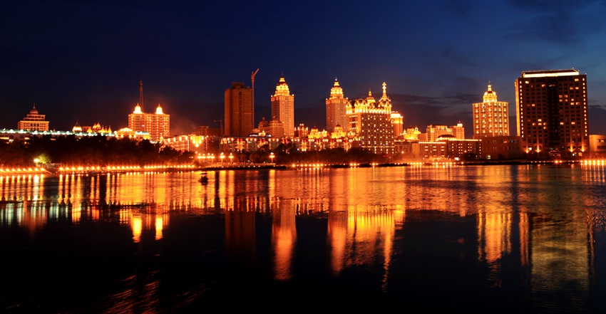 满州里最迷人的是夜晚,站在玻离窗前,正好看到满州里大饭店。这座歌特式的建筑每到夜晚金碧辉煌,就像一座大宫殿,褶褶闪光。大街上霓虹灯闪烁,变幻无穷。如果说白天的满州里是安静的,那夜晚的满州里则是沸腾的,来自全国各地的人都涌上街头,商店里的音乐震天响,酒吧、咖啡厅人影绰绰。这时的满州里成了一座不夜之城,灯红酒绿,让人眼花缭乱。