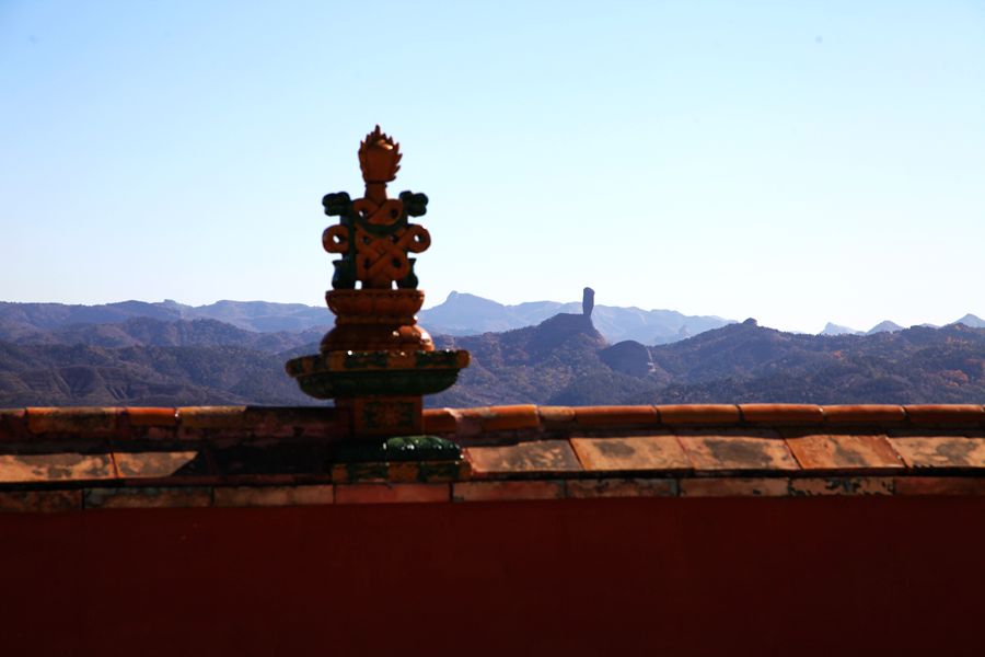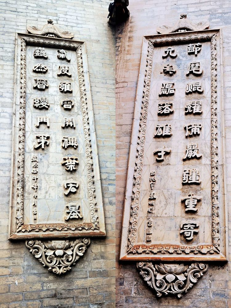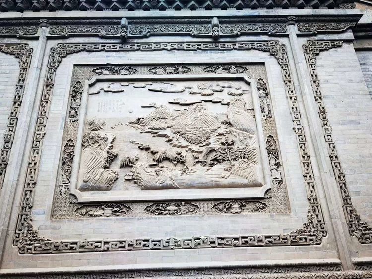 过庭(天井)影壁上有一幅大型“江山图”,雕有山川、树木、河流、云朵和一轮喷薄欲出的红日,显得颇有些气势。两边是字迹秀丽的隶书对联,内容是:“气度雍容开祀业宏基巍然簪缨门第,节麾焜耀备严疆重寄允矣磊落雄才”。这幅“江山图”下面刻着芭蕉扇、葫芦、采蓝和笛子,景区资料介绍说这是借八仙暗喻马步青当时官场失意,我对马步青不太了解,不知道是否如此。
