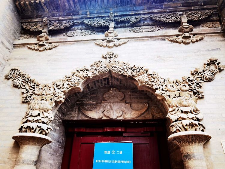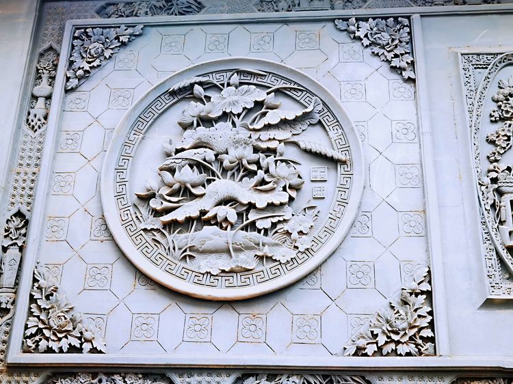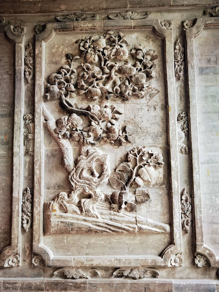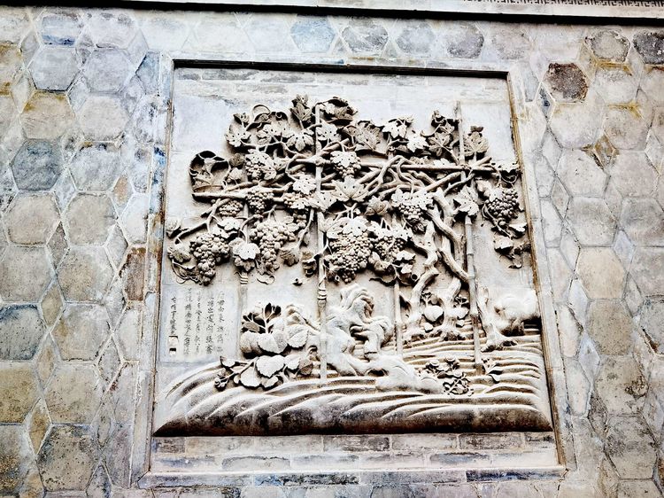 进入西洋式建筑特色的正门,有一幅寓意多子多福的葡萄砖雕,雕工精细传神,粗壮扭曲的藤蔓、层层叠叠的叶子、横横竖竖的竹架、累累下垂的果实,都栩栩如生,仿佛随手就可以摘下一串葡萄来尝一尝。