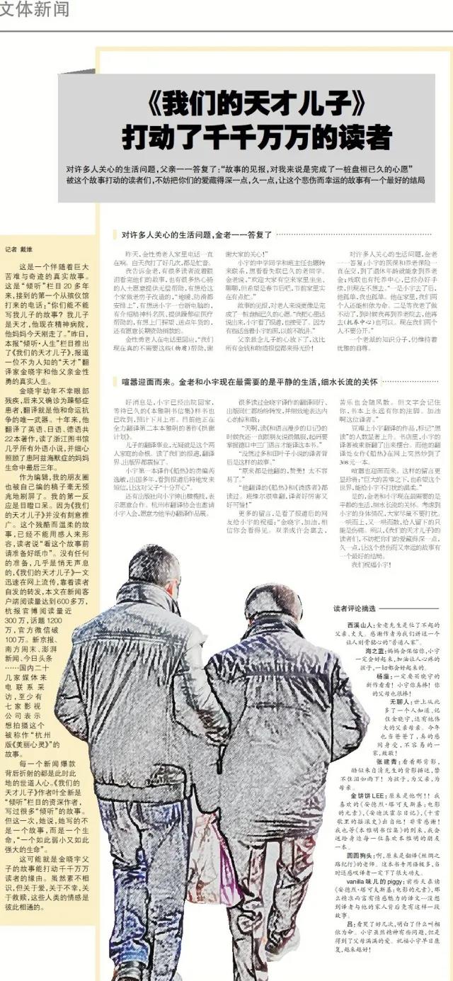 儿子的翻译事业,无疑就是这个两人家庭的命根。读了报道,翻译界、出版界都震惊了,还有出版社向小宇伸出橄榄枝,表示愿意合作。杭州市翻译协会也邀请小宇入会,愿意为他举办翻译作品展。很多读过金晓宇译作的翻译同行、出版同仁都纷纷转发,并细致地表达内心的惊和敬。