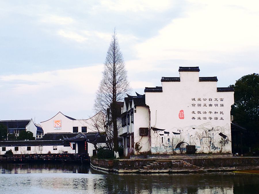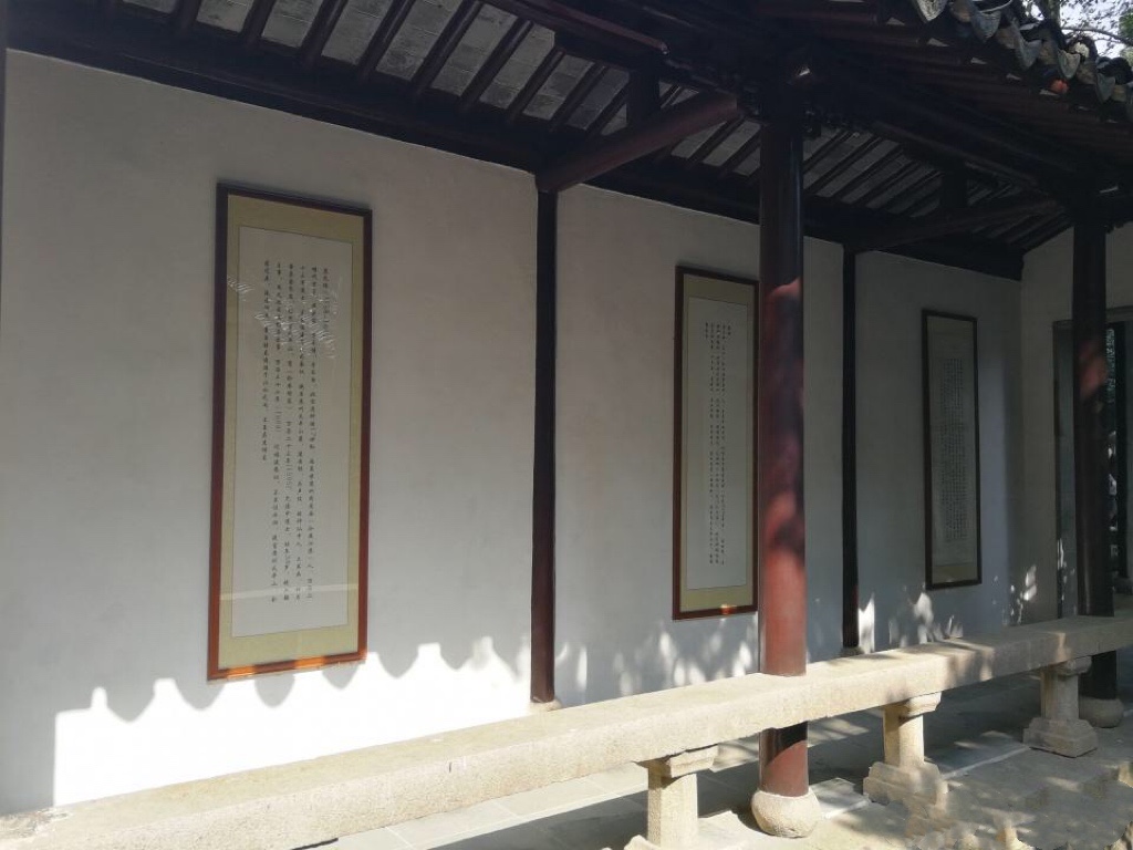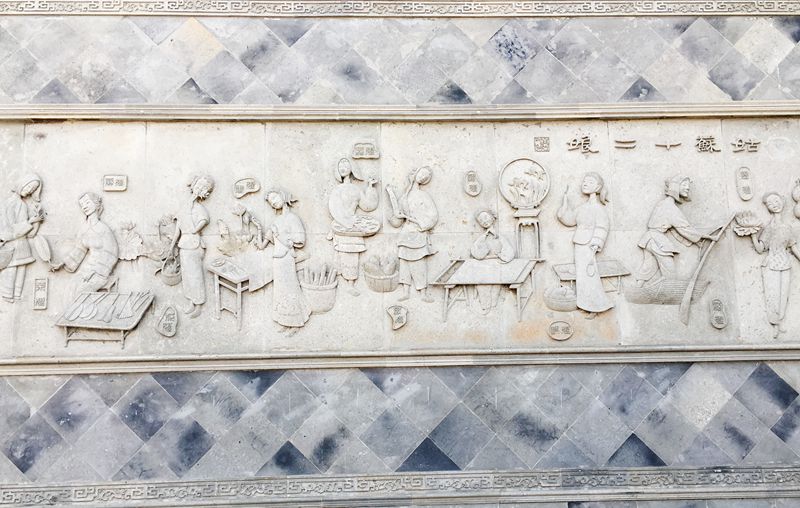 我不知道为何要把古镇锁起来,是为了保护这仅存的遗迹?还是为了当影视基地?不得而知。古镇外面的墙上,有壁画,刻着著名的姑苏十二娘,这是木渎古镇吴文化的瑰宝。这些吴娘勤劳善良,心灵手巧。我仔细数了数壁画上的十二娘,有船娘、绣娘、织娘、茶娘、扇娘、灯娘、琴娘、蚕娘、花娘、歌娘、画娘、蚌娘。其中,尤以绣娘最为典型。她们的绣品闻名中外,是国宝。