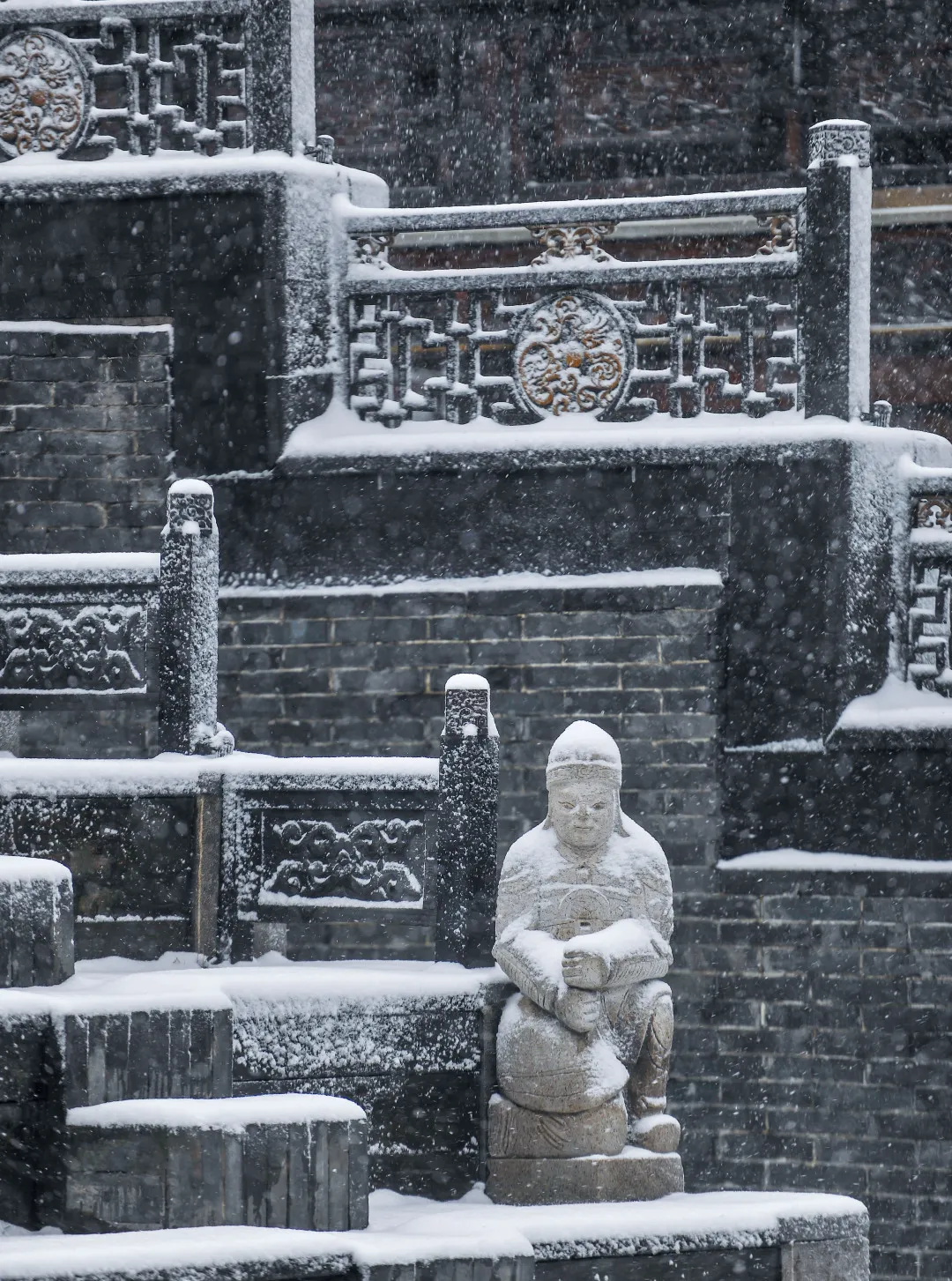 走进一方庭院,细细聆听雪花飘落的声音,白色的雪、灰色的砖,淡雅中不失高贵,沧桑里更显厚重。