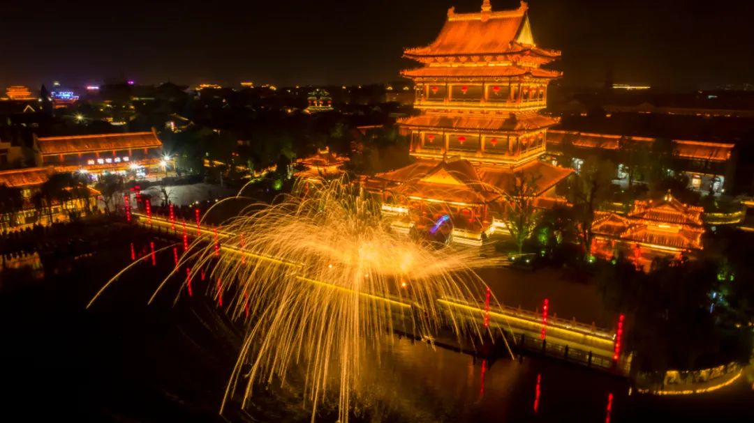 在复兴楼前,夜幕之下,汪塘上空,绚烂耀眼的“火龙钢花”在古城上演