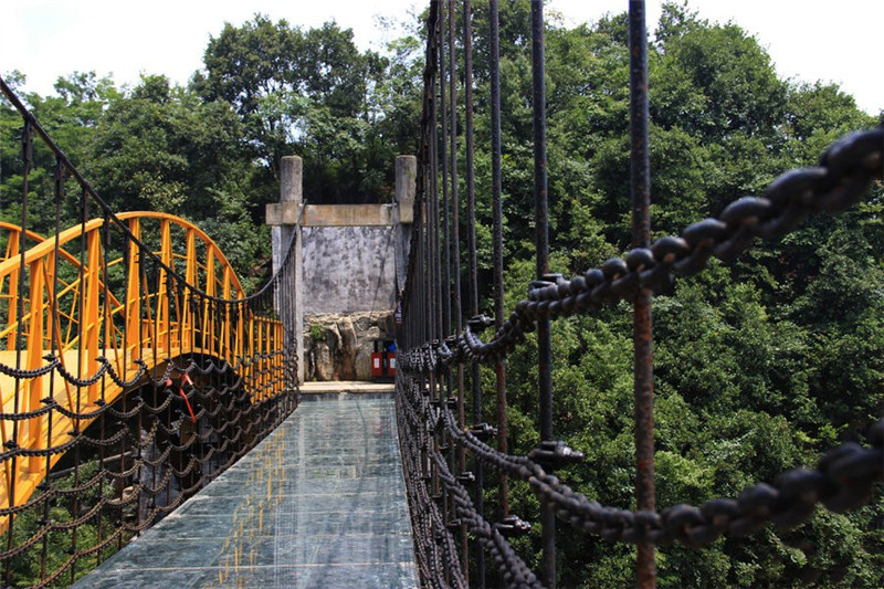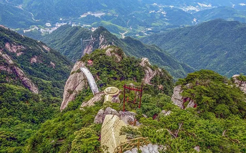 索道可直达“吴楚东南第一关”,站在吴楚亭上,可以清晰看到“金狮啸天”、“梦笔生花”、“盆景园”等鬼斧神工的自然景观。
