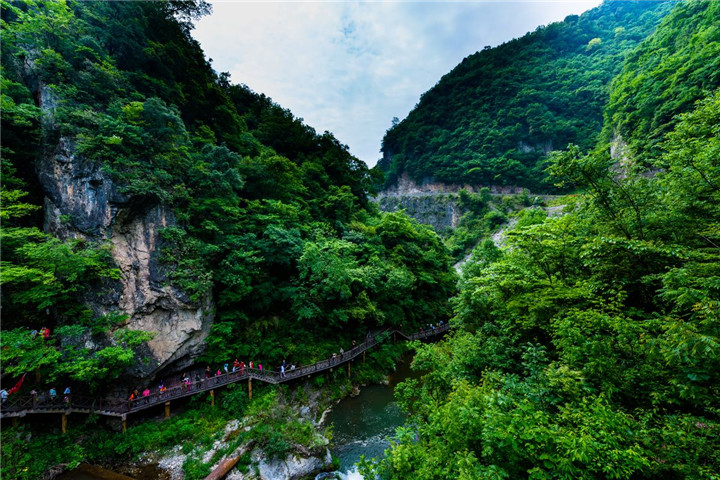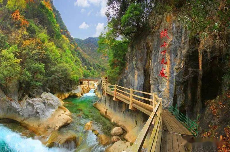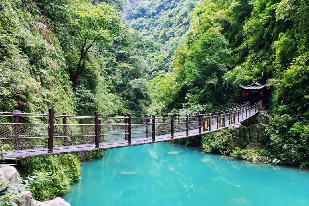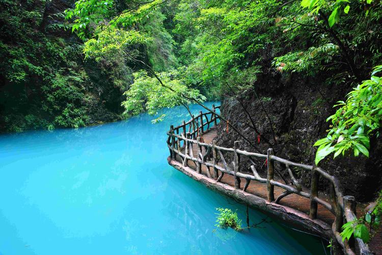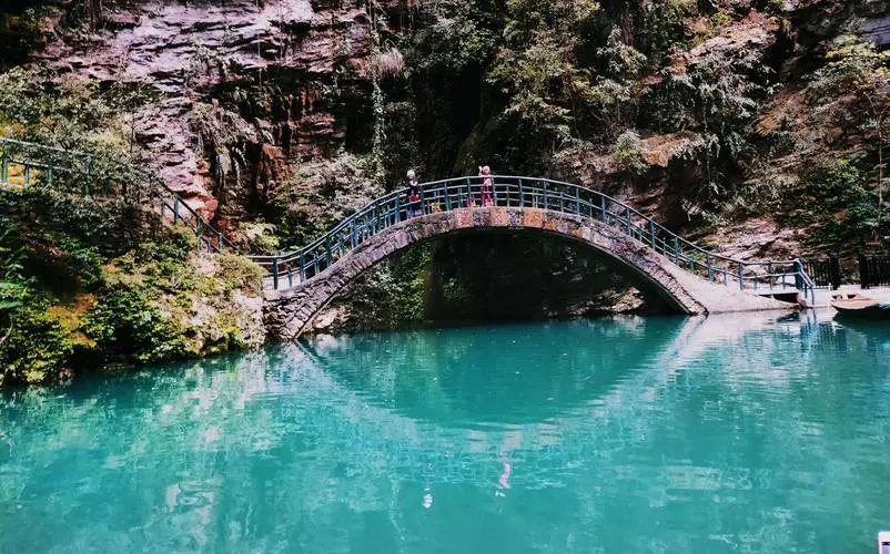 沿着峡谷栈道走去,碧绿的小溪流经谷底,空气感觉格外清新。两边山峰对峙,小道九曲连环,溪水静静地向远方流去,数座廊桥飞架,构画出一幅完整的水墨丹青。