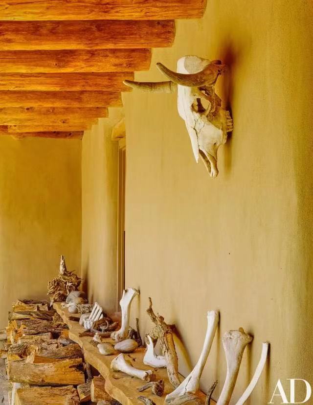 廊下摆着许多欧姬芙捡来的动物骸骨、石头、木桩……它们随意散落着,原始又孤独。