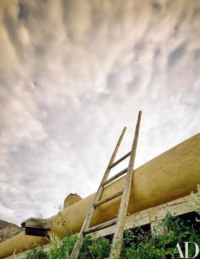 屋檐下还摆着一张梯子,欧姬芙喜欢爬上梯子坐在屋顶上眺望远方,她也喜欢在屋顶上招待客人。