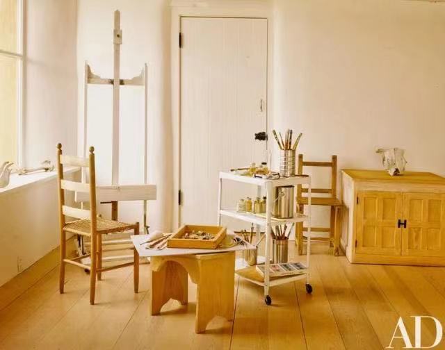 画室里的家具更少,只有两张简单的椅子,一个用于收纳画具的小推车、一个柜子、一张勒·柯布西耶风格的躺椅。
