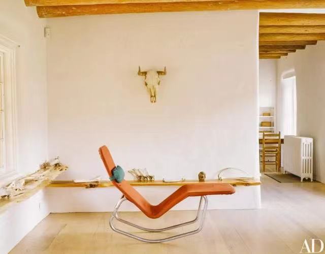 欧姬芙偶尔会躺在躺椅上小憩或是听音乐,这张躺椅有LC4躺椅的影子,但并非出自这个品牌,而是一个原创作品。