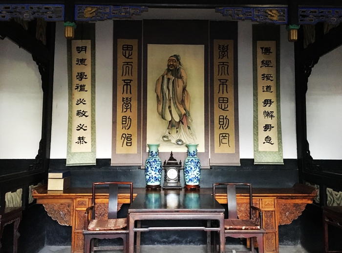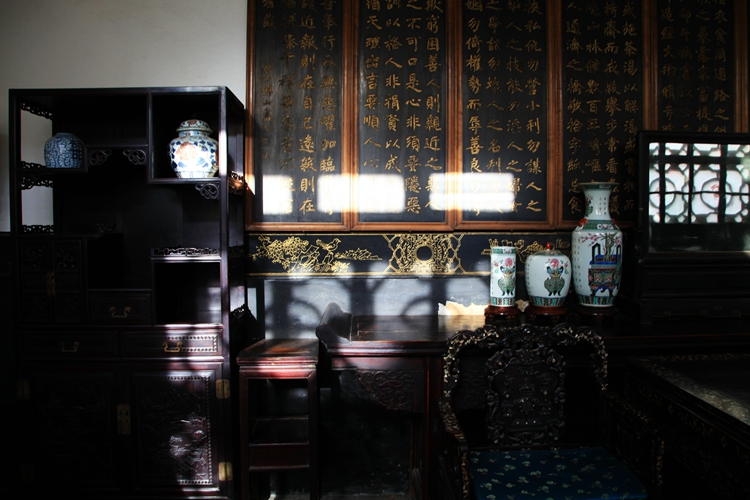 除了早餐的用餐区,欧姬芙还有一个正式的餐厅。餐厅陈列简单,配有一张胶合板的长桌、高背的中式椅子,背后还有一个简易的壁炉。