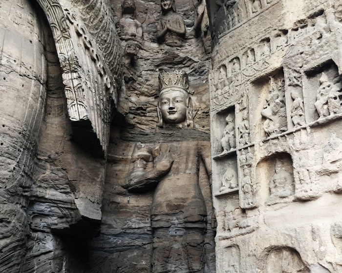 一整面墙的玻璃窗,将远处的悬崖戈壁框进房间里,苍茫的荒漠与蔚蓝的天空一览无余。