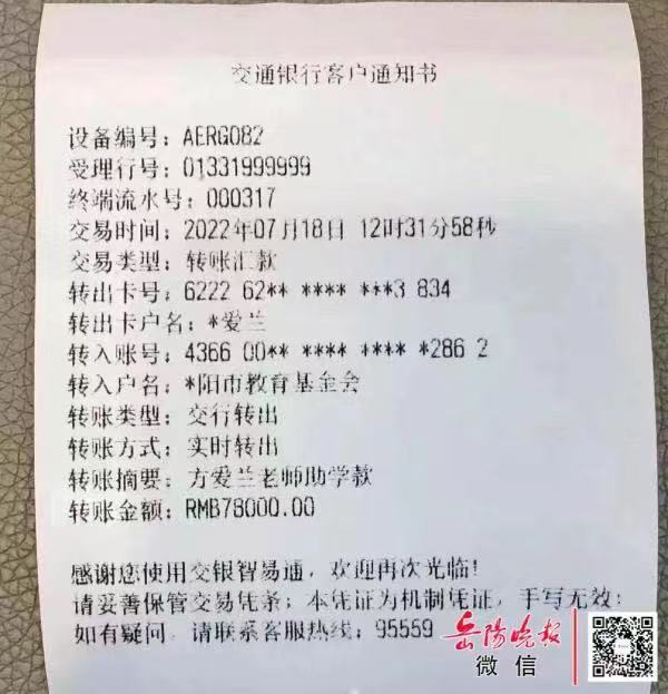 一周前,方爱兰老师的账户汇出了最后一笔善款,这些钱将用来帮助岳阳的6名学生完成学业。