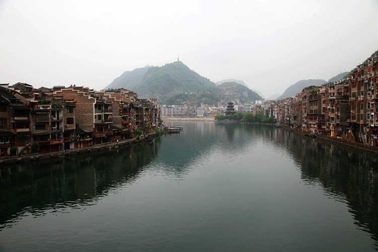 告别导游,站在路边打车去古镇。其实也不算远,打车费15元。出租车一直把我送到古镇的河边,司机说你顺着河走就能走到古街。就这样,我在细雨蒙蒙中,走进了镇远古镇。眼前的这条河呈S形,蜿蜒的河水穿镇而过。两岸是密密麻麻的房屋,四周皆山。回来查资料得知,这条大河叫舞阳河。此时,舞阳河上空飘着细雨,仿佛在给河水弹奏着欢快的歌。我沿着河畔徜徉,远山近水披上了一层迷迷漫漫的轻纱,河中小船悠悠,就像一幅轻烟淡水的水墨画卷一般。