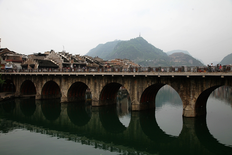 行不远既见一座古桥,桥上有一座三层的亭子,青砖黛瓦,飞檐翘角。这桥是镇远古镇的标志建筑,叫“祝圣桥”,也叫老桥。桥面很宽,青石板铺就,走在上面古意盎然。桥洞有几个圆圆的孔,从圆孔里看两岸的粉墙黛瓦,颇有江南水乡风情。站在桥上眺望,对面山上有层层叠叠的古建筑,倒映水中非常漂亮。我跟人打听,人家说那是玉屏山,是个景点。由于时间关系,无缘去了。我想拍个古镇的全景,那人说去玉皇阁能观全景,我问玉皇阁在哪里?那人用手一指,就在前面。我一看距离很近,山也不太高,遂决定登阁看古镇全景。