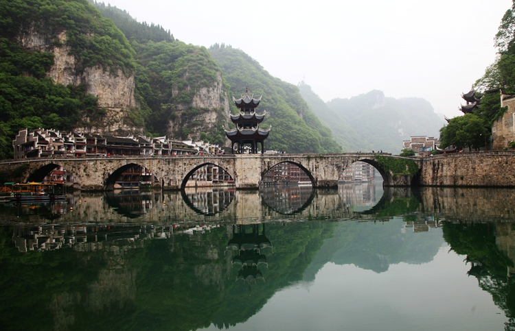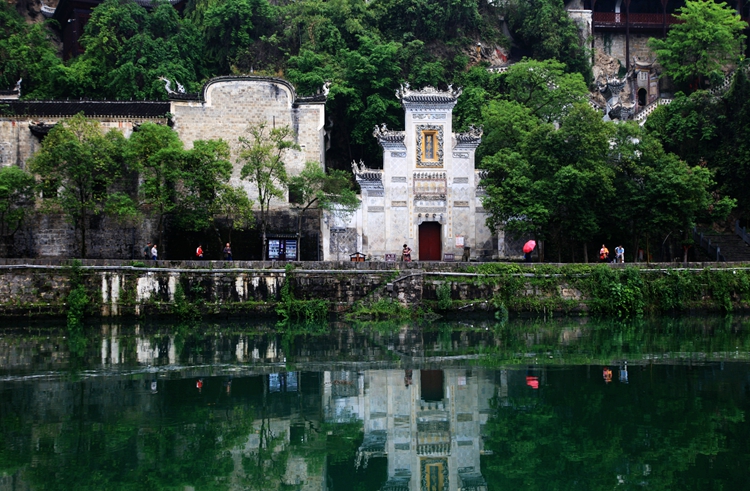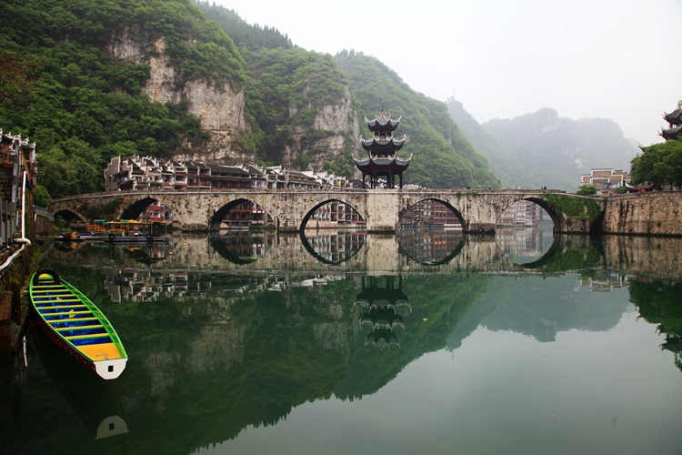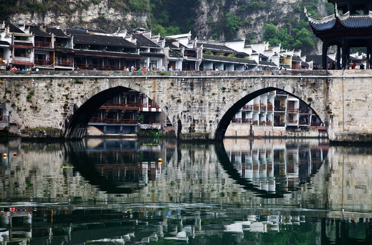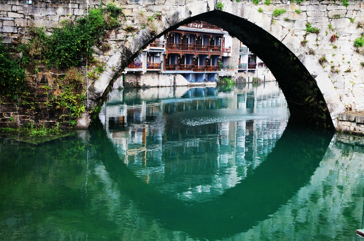 站在桥头观赏,让我心醉神迷。尤其爱桥下的涵碧潭,水碧似翠玉,潭平绝理纹,幽谷风乍起,吹碎一池云。只觉眼前诗意盎然,美不胜收。我跨过桥头,站在对岸观赏,清澈如镜的潭水把群山、古树、桥景、绿植并入水中,倒影鳞鳞,波光烁烁,山光潭景,分外迷人。桥上人影倒立,桥下小船悠游,桥头还有美姣娘,我恍若进了桃花源,不知今昔是何昔了。听说小七孔的清晨更美,云雾缭绕,恍若仙境。可惜跟团游不能尽兴,留下了遗憾。(待续)
