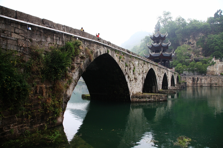 小七孔古桥,不愧是压轴景点,美的无法形容,仿佛是现实版的绿野仙踪,让我挪不开眼。这是一座小巧玲珑的七孔古石桥,长约25米,由麻石条砌成,桥身爬满藤蔓和蕨类,走在上面古意悠悠。桥下是绿得令人心醉的涵碧潭,传说这里发生过一段凄美的爱情故事,很是感人,所以这桥也叫忠贞桥。相传情侣走过便可执手偕老。桥上有许多青年男女携手相伴,可能是来见证自己的爱情吧。