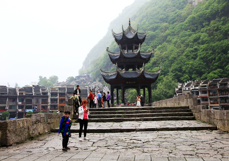 桥上人来人往,还有苗民休闲唠嗑。听他们说,这样的桥苗寨有五座,一座一个样子,这是一号风雨桥,也叫龙潭桥。我见桥的两边有两条分叉路,一边是游方街,一边是我走来的古街。游方街在对岸,只见密密麻麻的吊脚楼,全是客栈、酒店、商铺。从桥上过来,我一直走到五号风雨桥,把整个街道全逛了一遍,累的够呛。其中,三号风雨桥最为出名,因为这桥叫情人桥,游客慕名而来,年轻情侣牵着手,成了一道亮丽的风景。