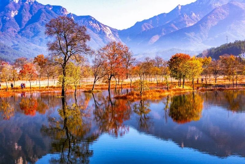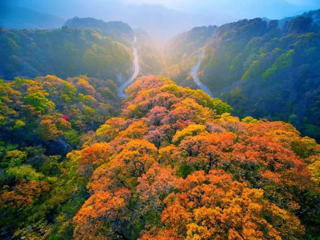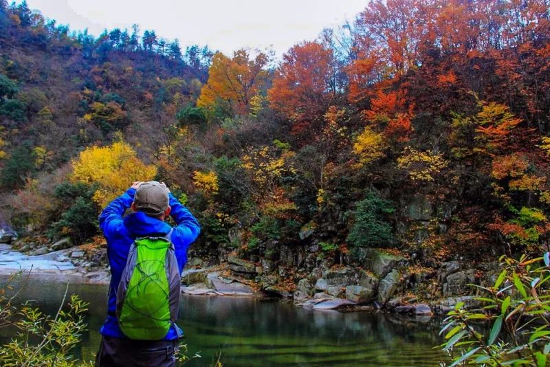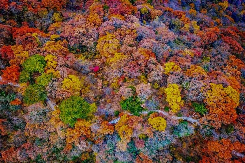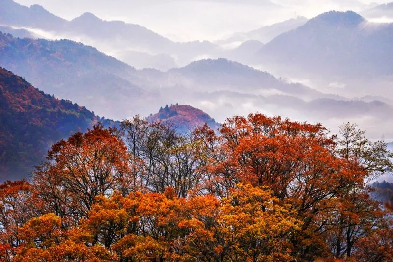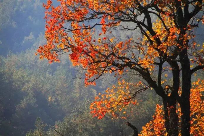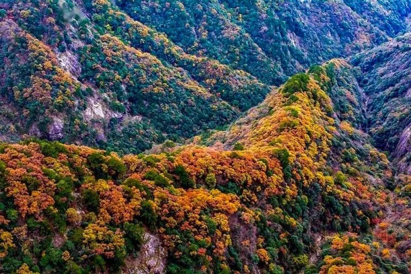 深秋时节,漫山遍野的银杏、乌桕、槭树、黄栌、红枫等树种的叶子会逐渐形成翠绿、浅黄、明黄、鲜红、深红等不同色彩。