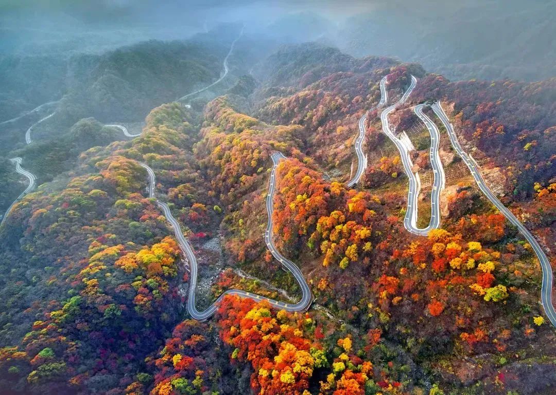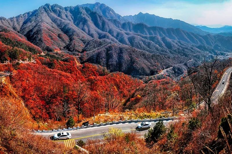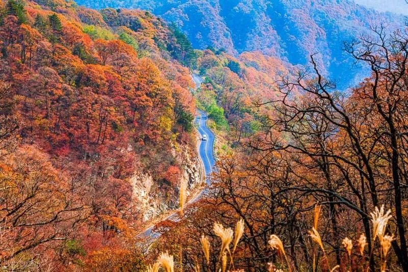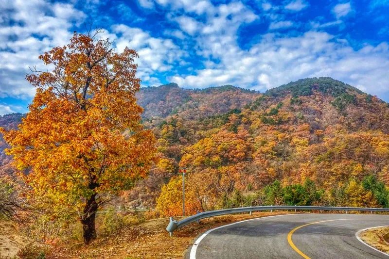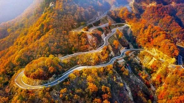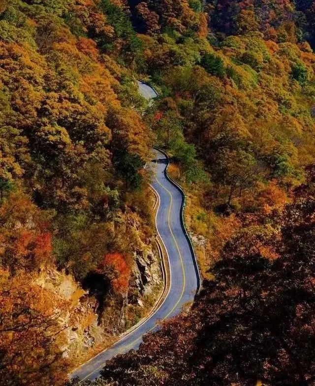 金秋时节,这条路犹如无边无际的重彩油墨,把群山装点得美丽极了!山顶上一道道美丽的景致,更为这童话般世界增添了神奇的色彩,车中观景,景随车行。