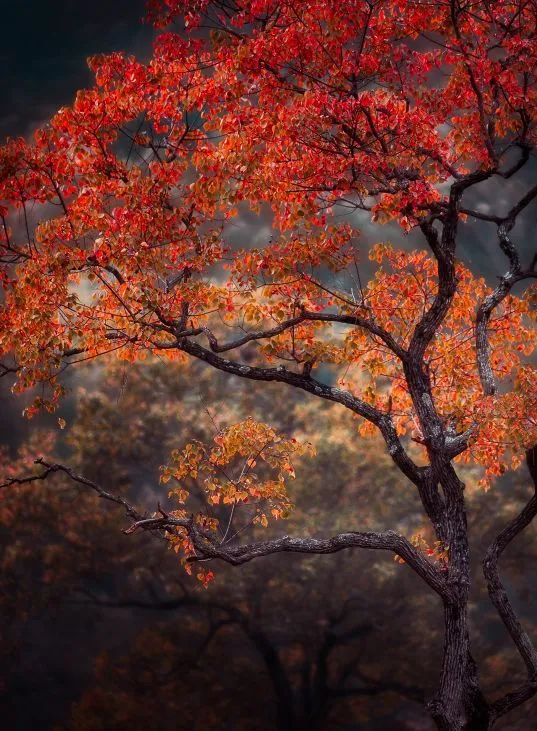 漫山遍野的红叶乌桕树,或三五成群抱团于田间地头,争红斗艳;或孑然一身独立寒秋,矗立在山涧溪流旁,清雅脱俗。