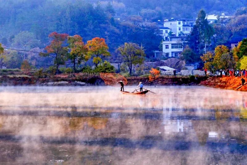 远山的轮廓一点一点露出真容,五彩斑斓的叶子倒影在水镜之中,村民撒网捕鱼,一幅传统的水墨丹青画轴就此展开。