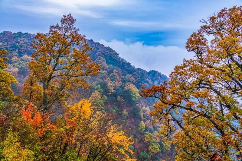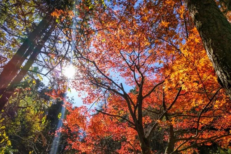 阳光、蓝天、树叶,交相辉映。不必急着赶路,慢下来,就这样,好好地欣赏山间的秋色。